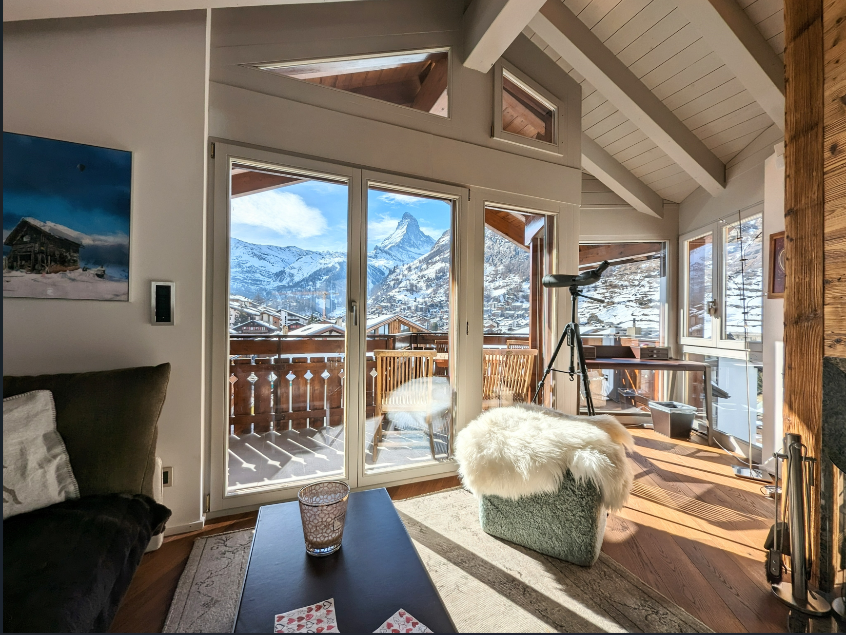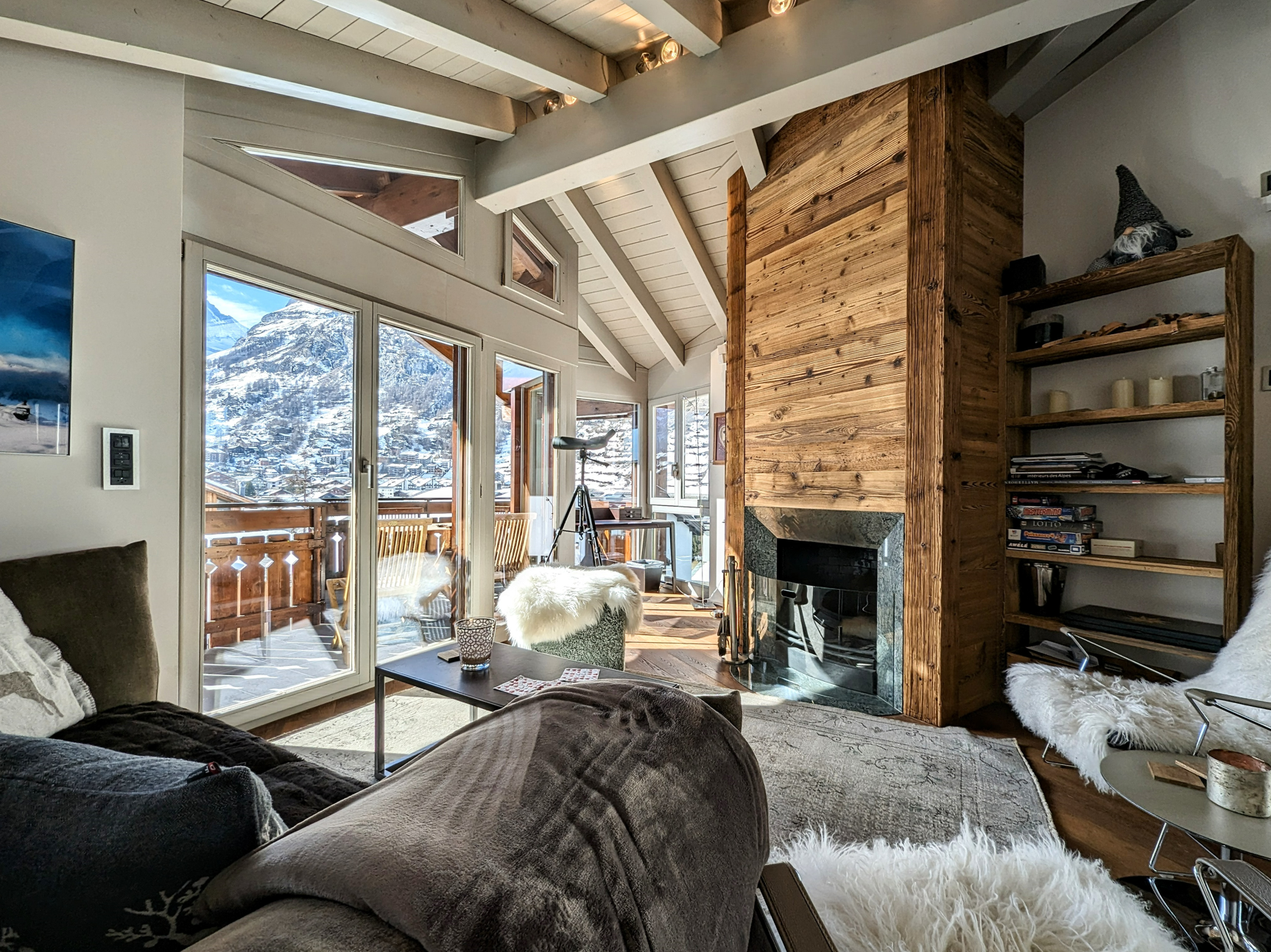 Ein atemberaubendes großflächiges Unterdach-Wohnzimmer mit diesem Ausbaustandard findet sich in Zermatt sehr selten. Die verwinkelte Dachkonstruktion sorgt für ein interessantes, großvolumiges Raumgefühl.