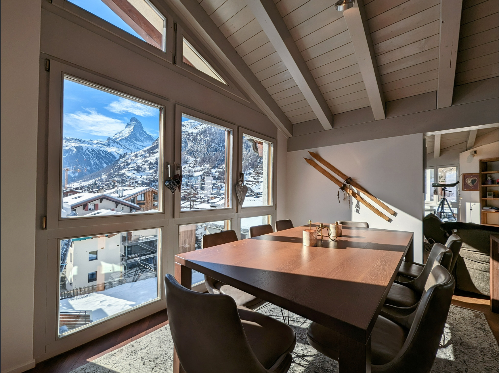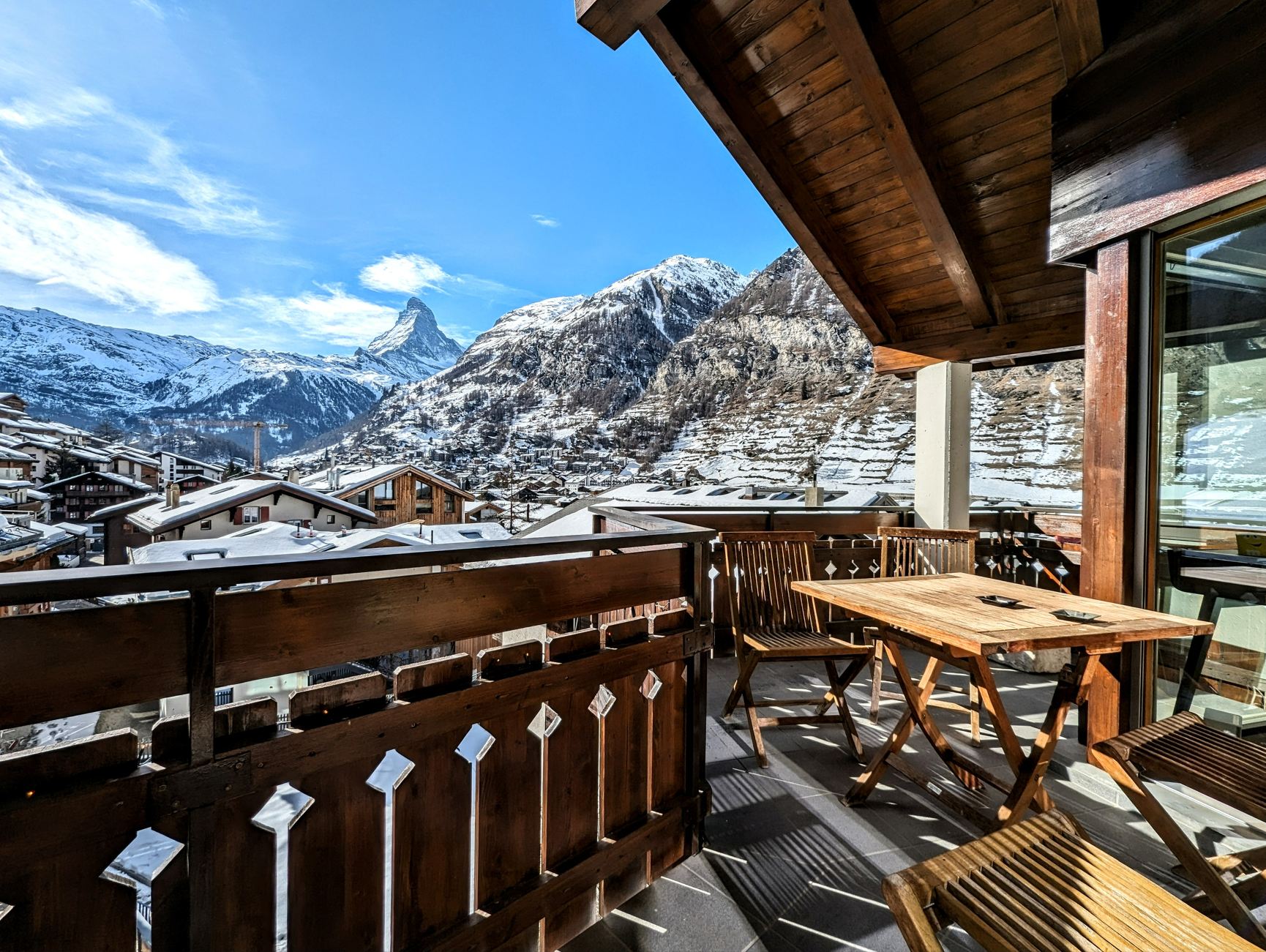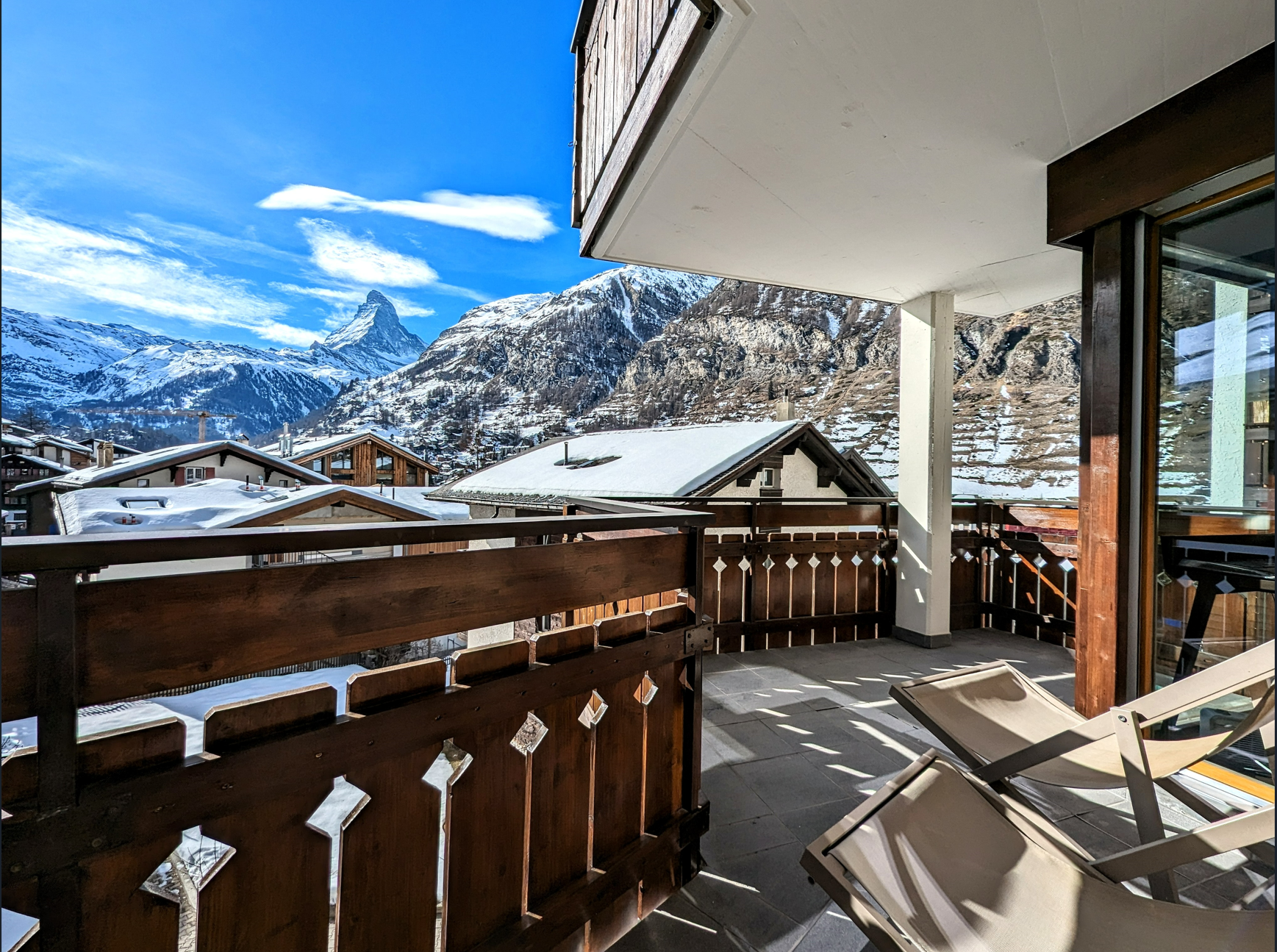 Direkt vom Wohnbereich gelangen die Eigentümer auf den großzügigen Sonnenbalkon welcher mit seiner Matterhornsicht beeindruckt.