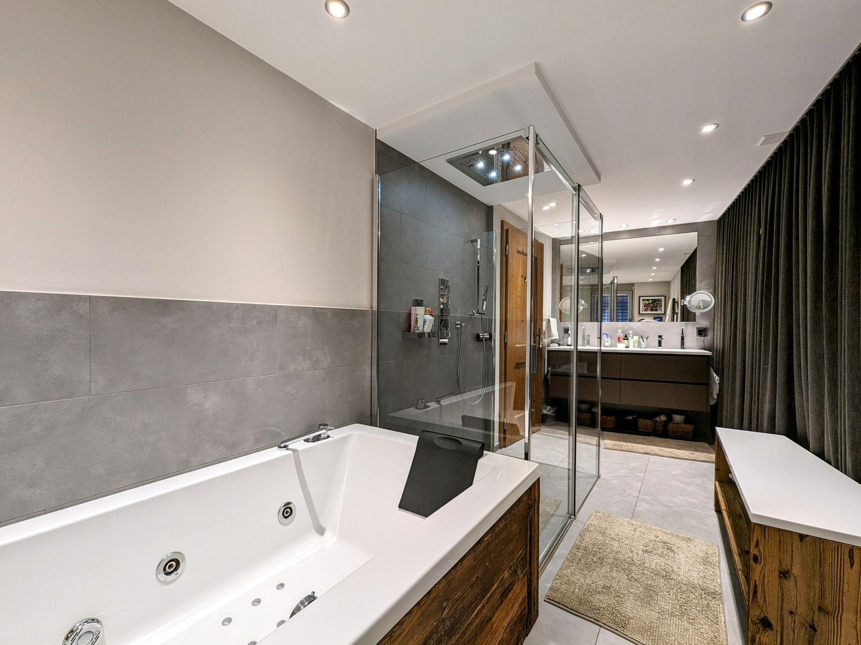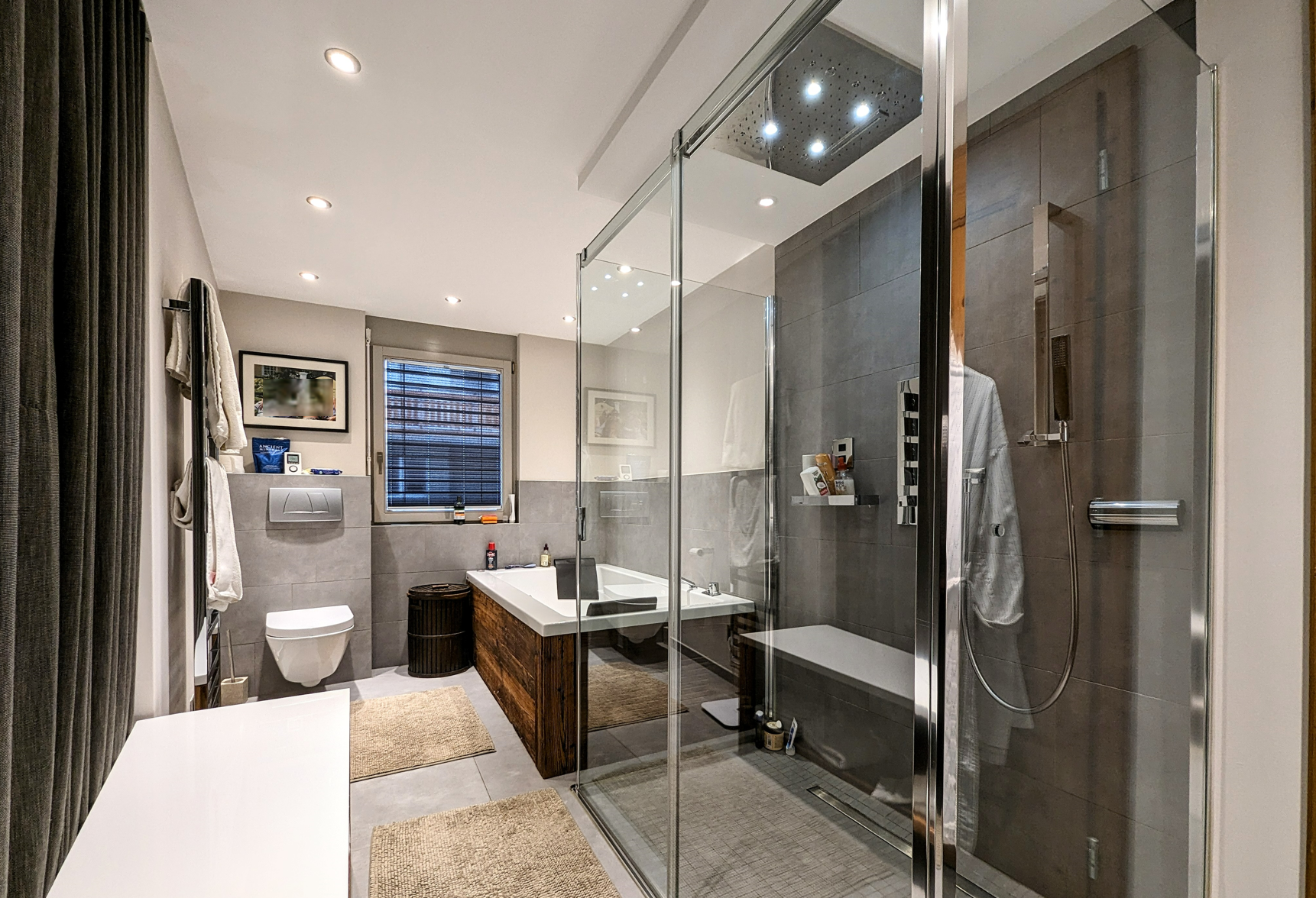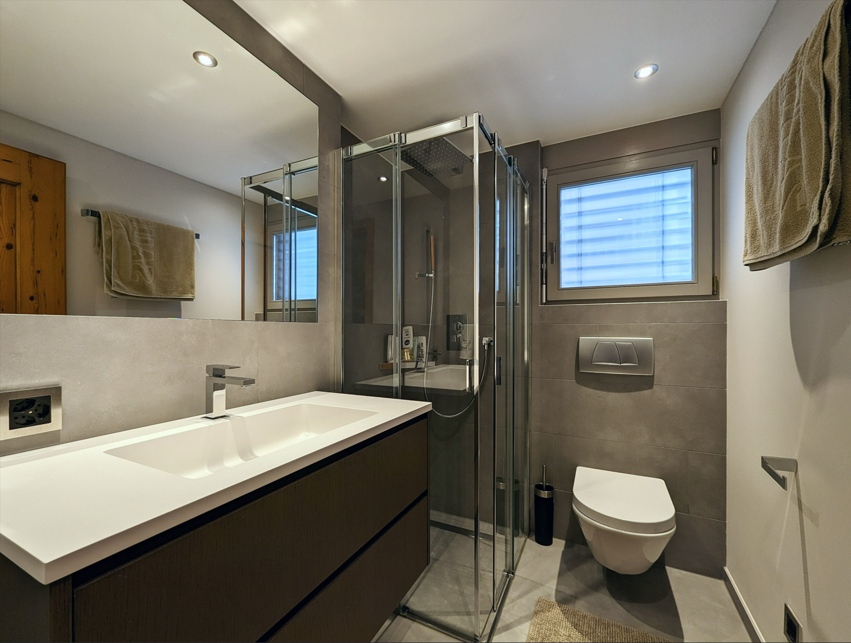 Das andere kleinere Badezimmer gefällt durch einen hochwertigen, hellen Ausbau und verfügt über Dusche, WC, Lavabo.