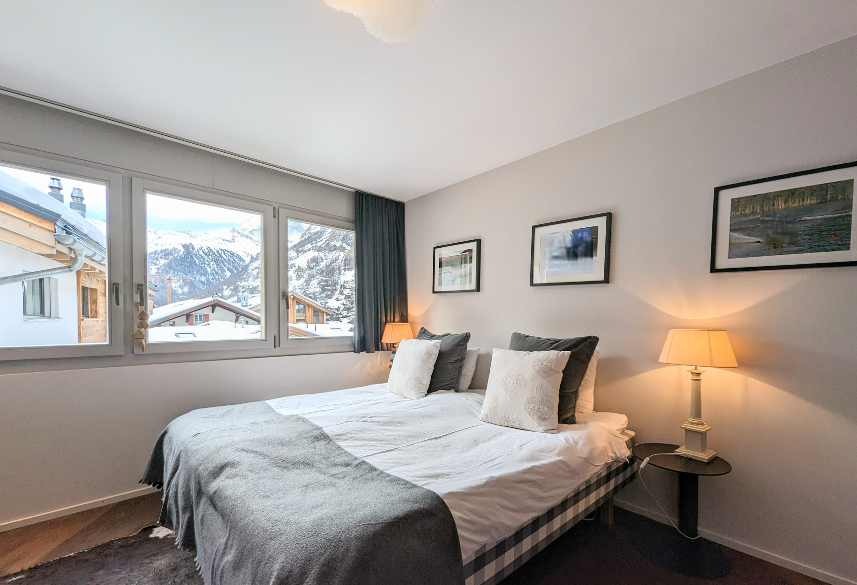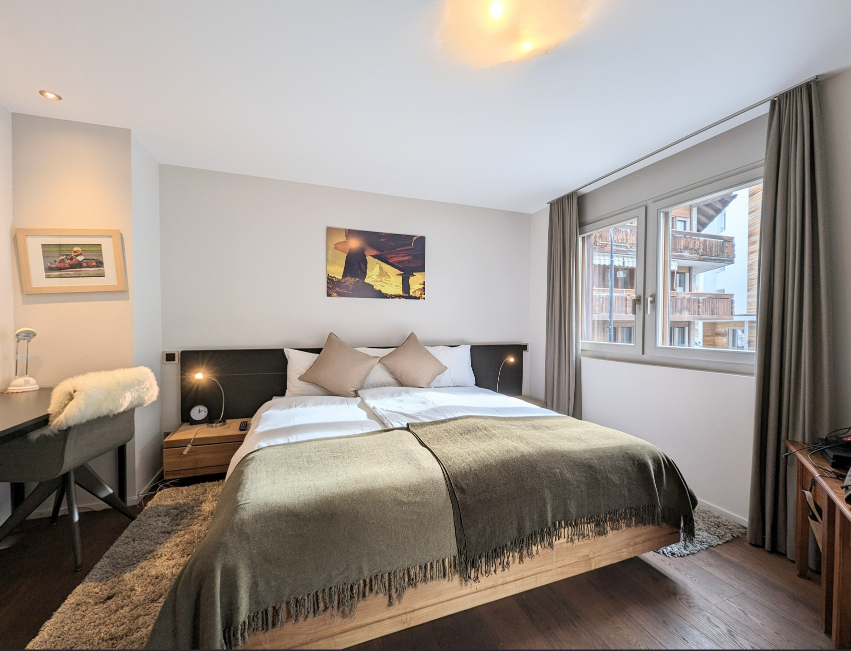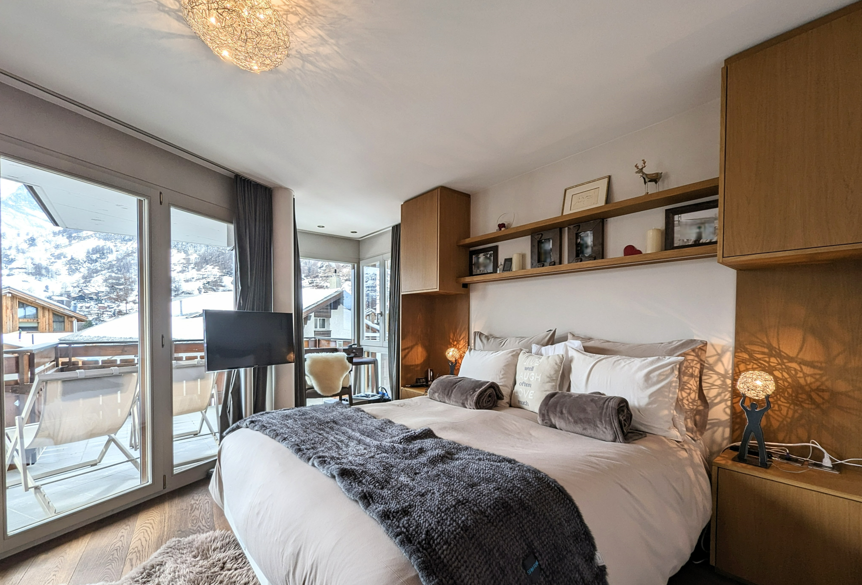 Im unteren Geschoss dieser Duplex-Dachwohnung befinden sich die drei Schlafzimmer. Das großzügige Masterschlafzimmer mit eigenem Balkon und Matterhornblick, gefällt durch seine außergewöhnlich hochwertige Innenarchitektur, bei welcher das in Zermatt beliebte Alpin-Chic Verwendung gefunden hat. Dieser Stil zieht sich wie ein roter Faden durch den Rest der Wohnung.